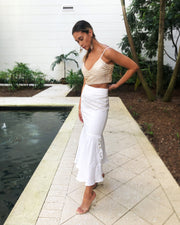 Tailored Italian linen skirt with an invisible zipper in the back. the circle skirt design gives off the perfect twirl. Grommets with a laced up linen bow on the side for that extra gorgeous feel.