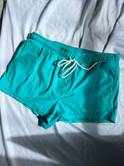 Fitted short men’s swim shorts. “Almost” banana hammock. Designed with luxe matte lycra material and quality comfortable lining for full support. Small pocket on back and deep front pockets. Finished with an elastic waist and cord drawstring.