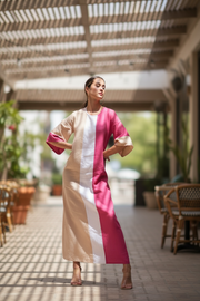 Tailored luxe linen kaftan with side pockets and invisible zipper in the back. Super flattering to the body. Best seller, can be dressed up or down. Available in a solid color or tri-color block.